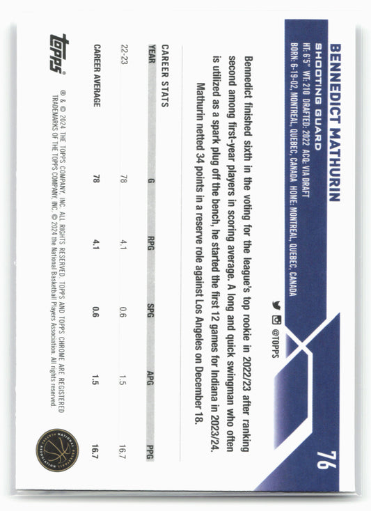 This is a nice example of a 2023-24 Topps Chrome #76 Bennedict Mathurin Other important information about this card:In 2023 Bennedict Mathurin played for the Indiana Pacers.Please check out our...