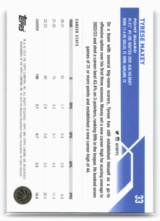This is a nice example of a 2023-24 Topps Chrome #33 Tyrese Maxey Other important information about this card:In 2023 Tyrese Maxey played for the Philadelphia 76ers.Please check out our...