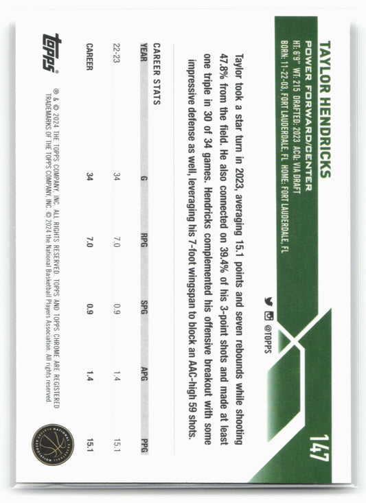 This is a nice example of a 2023-24 Topps Chrome #147 Taylor Hendricks Other important information about this card:RCIn 2023 Taylor Hendricks played for the Utah Jazz.Please check out our...