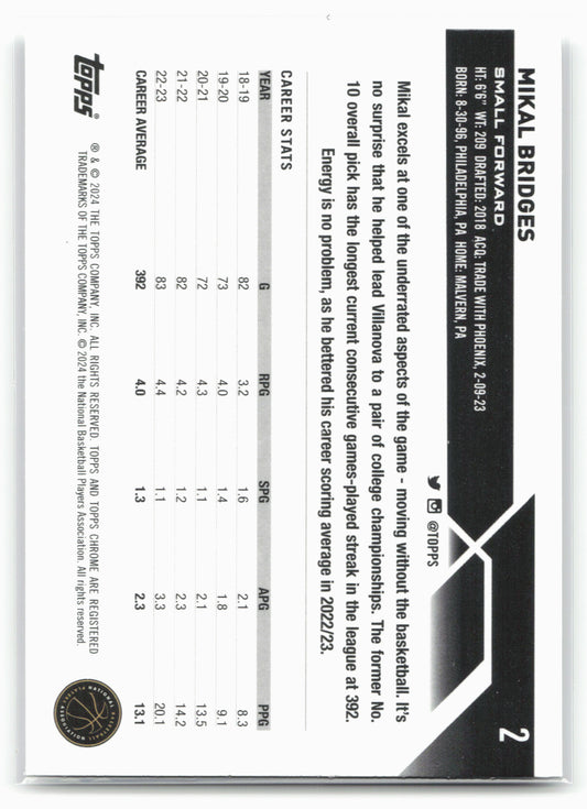 This is a nice example of a 2023-24 Topps Chrome #2 Mikal Bridges Other important information about this card:In 2023 Mikal Bridges played for the Brooklyn Nets.Please check out our...