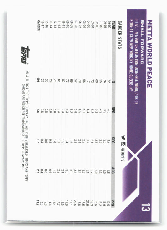 This is a nice example of a 2023-24 Topps Chrome #13 Metta World Peace Other important information about this card:In 2023 Metta World Peace played for the Los Angeles Lakers.Please...