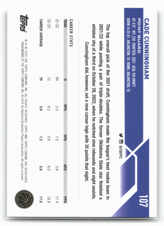 This is a nice example of a 2023-24 Topps Chrome #107 Cade Cunningham Other important information about this card:In 2023 Cade Cunningham played for the Detroit Pistons.Please check out our...