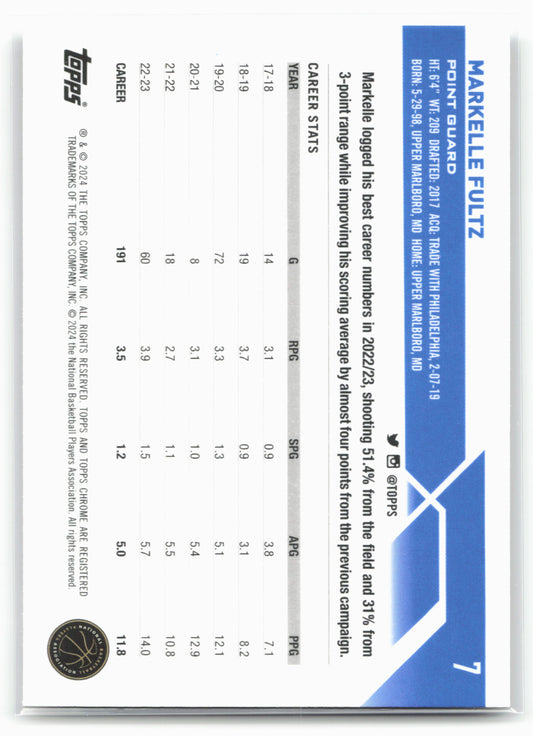 This is a nice example of a 2023-24 Topps Chrome #7 Markelle Fultz Other important information about this card:In 2023 Markelle Fultz played for the Orlando Magic.Please check out our...