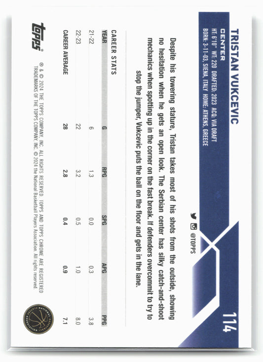 This is a nice example of a 2023-24 Topps Chrome #114 Tristan Vukcevic Other important information about this card:17753RCIn 2023 Tristan Vukcevic played for the Washington Wizards.Please check out our...