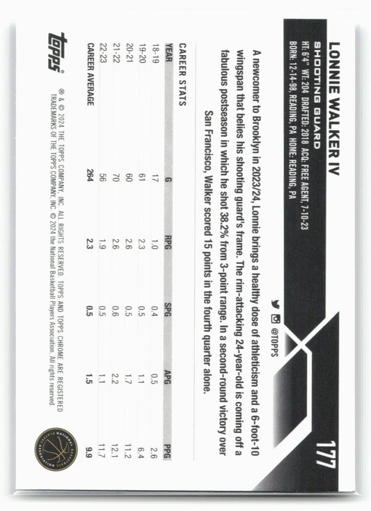 This is a nice example of a 2023-24 Topps Chrome #177 Lonnie Walker IV Other important information about this card:17754In 2023 Lonnie Walker IV played for the Brooklyn Nets.Please check...