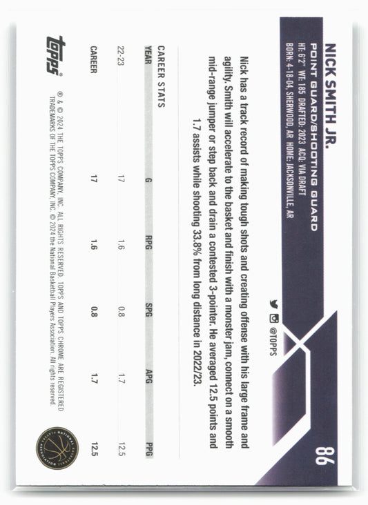 This is a nice example of a 2023-24 Topps Chrome #86 Nick Smith Jr. Other important information about this card:17756RCIn 2023 Nick Smith Jr. played for the Charlotte Hornets.Please check...
