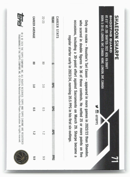This is a nice example of a 2023-24 Topps Chrome #71 Shaedon Sharpe Other important information about this card:17758In 2023 Shaedon Sharpe played for the Portland Trail Blazers.Please check out...
