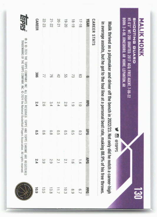 This is a nice example of a 2023-24 Topps Chrome #130 Malik Monk Other important information about this card:17759In 2023 Malik Monk played for the Sacramento Kings.Please check out our...