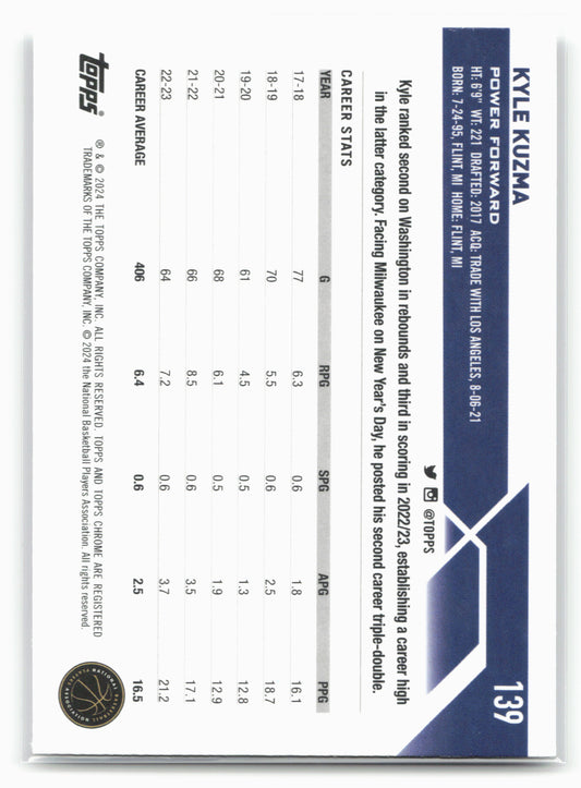 This is a nice example of a 2023-24 Topps Chrome #139 Kyle Kuzma Other important information about this card:17761In 2023 Kyle Kuzma played for the Washington Wizards.Please check out our...
