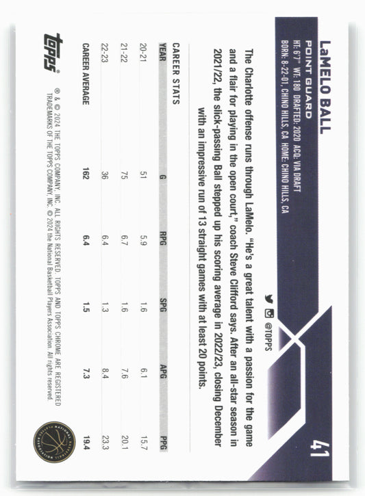 This is a nice example of a 2023-24 Topps Chrome #41 LaMelo Ball Other important information about this card:17762In 2023 LaMelo Ball played for the Charlotte Hornets.Please check out our...