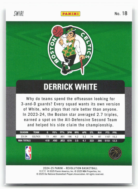 This is a nice example of a 2024-25 Panini Revolution #18 Derrick White Red Swirl Other important information about this card:In 2024 Derrick White played for the Boston Celtics.Please check...