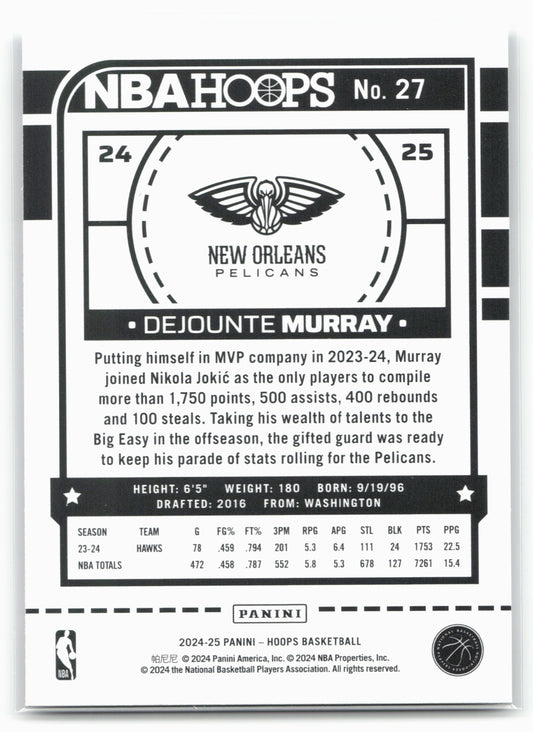 This is a nice example of a 2024-25 Hoops #27 Dejounte Murray Impulse Other important information about this card:In 2024 Dejounte Murray played for the New Orleans Pelicans.Please check out...