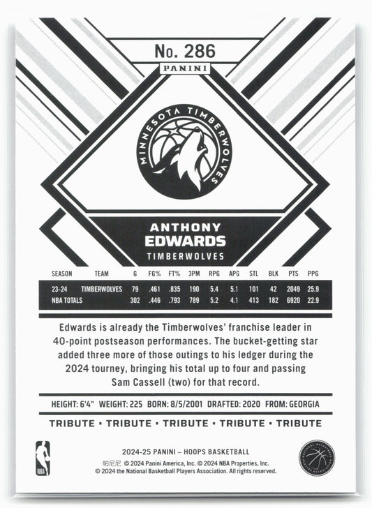 This is a nice example of a 2024-25 Hoops #286 Anthony Edwards Other important information about this card:In 2024 Anthony Edwards played for the Minnesota Timberwolves.Please check out our other...
