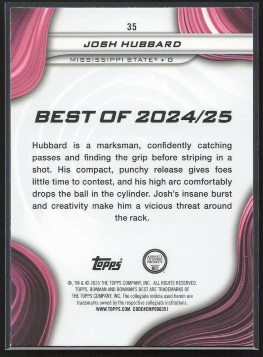 This is a nice example of a 2024-25 Bowman's Best University #35 Josh Hubbard Other important information about this card:In 2024 Josh Hubbard played for the Mississippi State Bulldogs.Please check...
