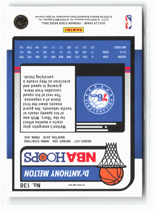 This is a nice example of a 2023-24 Panini Premium Stock #138 De'Anthony Melton Ice Prizm Other important information about this card:In 2023 De'Anthony Melton played for the Philadelphia 76ers.Please...