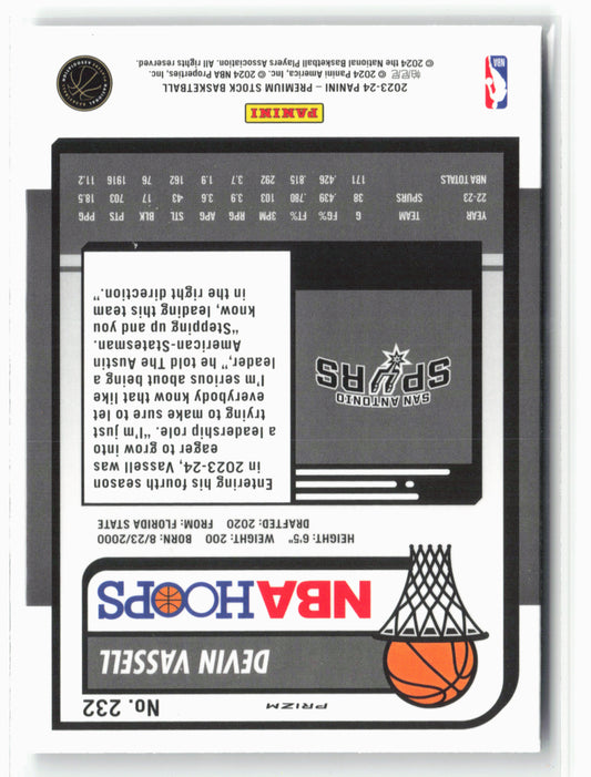 This is a nice example of a 2023-24 Panini Premium Stock #232 Devin Vassell Ice Prizm Other important information about this card:In 2023 Devin Vassell played for the San Antonio...