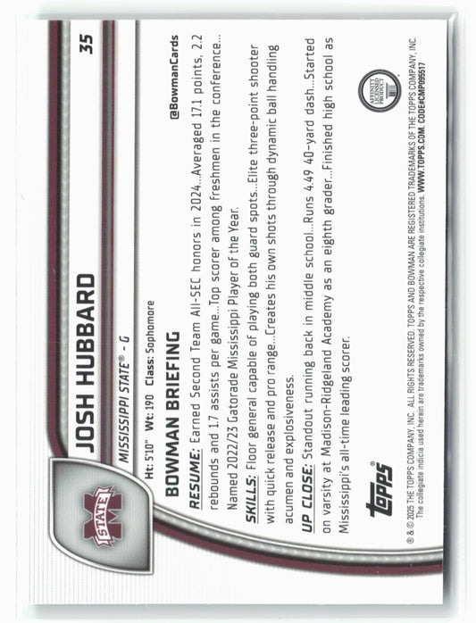 This is a nice example of a 2024-25 Bowman University Chrome #35 Josh Hubbard Green Shimmer Refractor Other important information about this card:In 2024 Josh Hubbard played for the Mississippi...