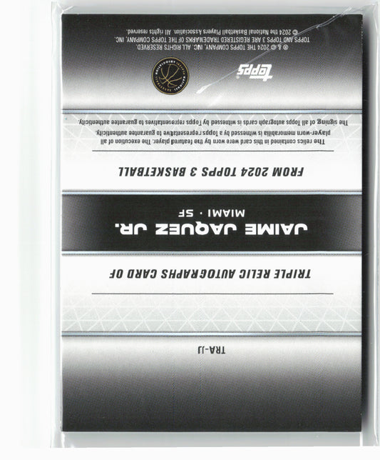 This is a nice example of a Topps 3 # Jaime Jaquez Jr. Triple Relic Autographs Other important information about this card:In 2023 Jaime Jaquez Jr. played for the Miami...