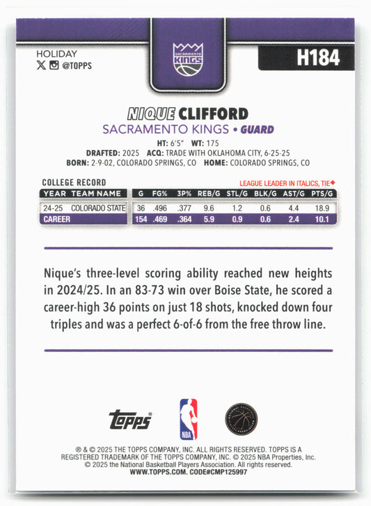 This is a nice example of a 2025-26 Topps Holiday #H184 Nique Clifford Other important information about this card:RCIn 2025 Nique Clifford played for the Sacramento Kings.Please check out our...