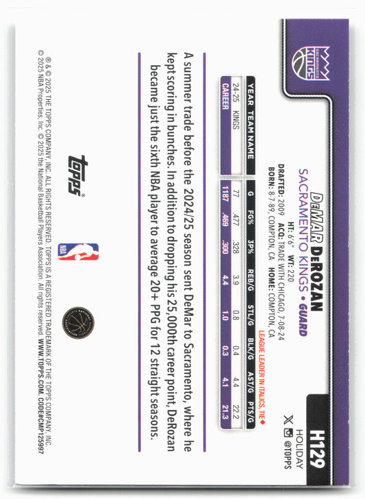 This is a nice example of a 2025-26 Topps Holiday #H129 DeMar DeRozan Other important information about this card:In 2025 DeMar DeRozan played for the Sacramento Kings.Please check out our...