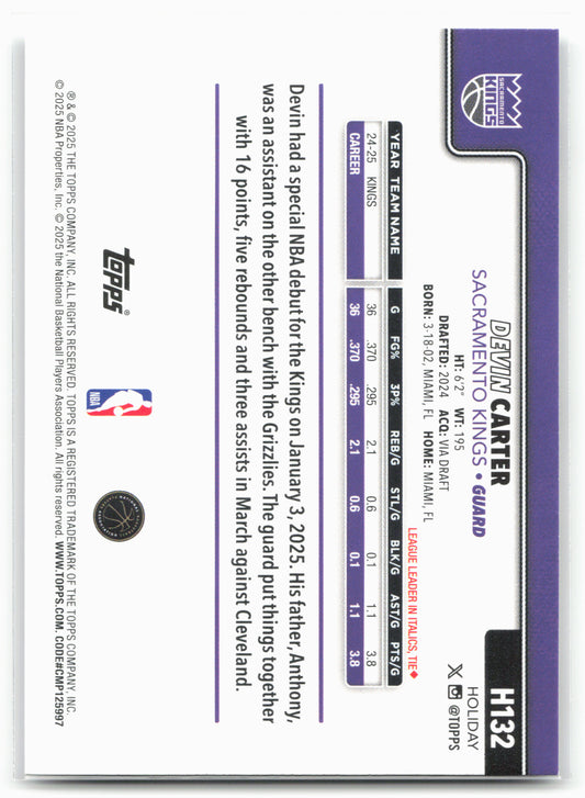This is a nice example of a 2025-26 Topps Holiday #H132 Devin Carter Other important information about this card:In 2025 Devin Carter played for the Sacramento Kings.Please check out our...