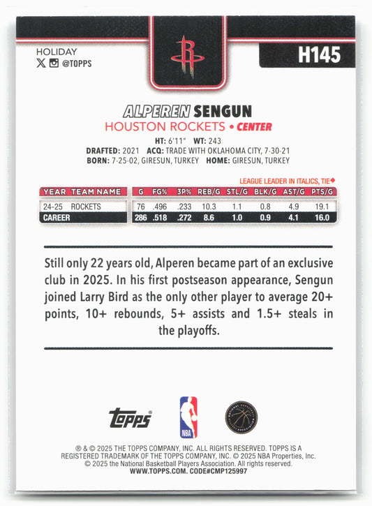 This is a nice example of a 2025-26 Topps Holiday #H145 Alperen Sengun Other important information about this card:In 2025 Alperen Sengun played for the Houston Rockets.Please check out our...
