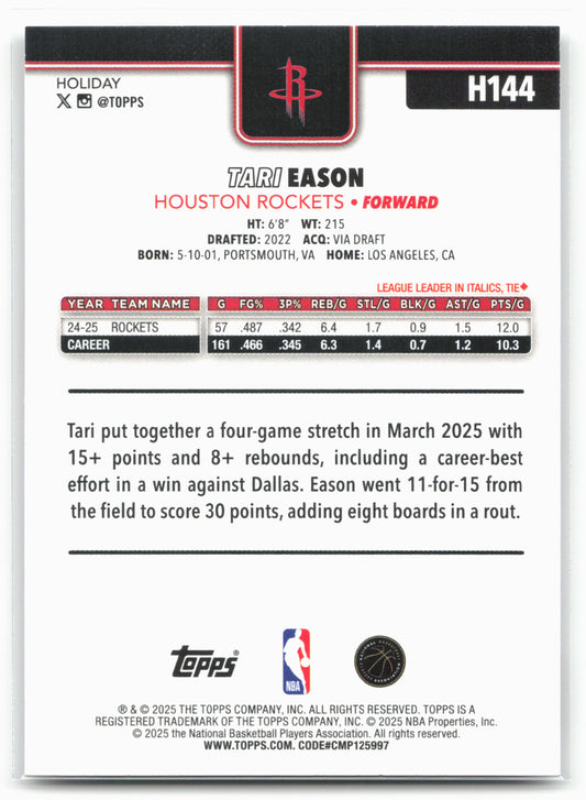 This is a nice example of a 2025-26 Topps Holiday #H144 Tari Eason Other important information about this card:In 2025 Tari Eason played for the Houston Rockets.Please check out our...