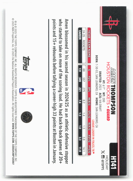 This is a nice example of a 2025-26 Topps Holiday #H141 Amen Thompson Other important information about this card:In 2025 Amen Thompson played for the Houston Rockets.Please check out our...