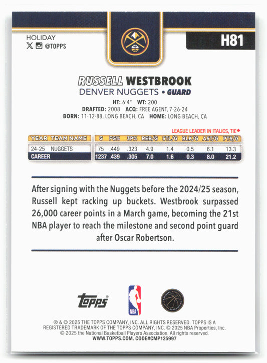 This is a nice example of a 2025-26 Topps Holiday #H81 Russell Westbrook Other important information about this card:In 2025 Russell Westbrook played for the Denver Nuggets.Please check out our...