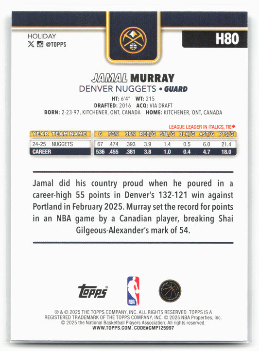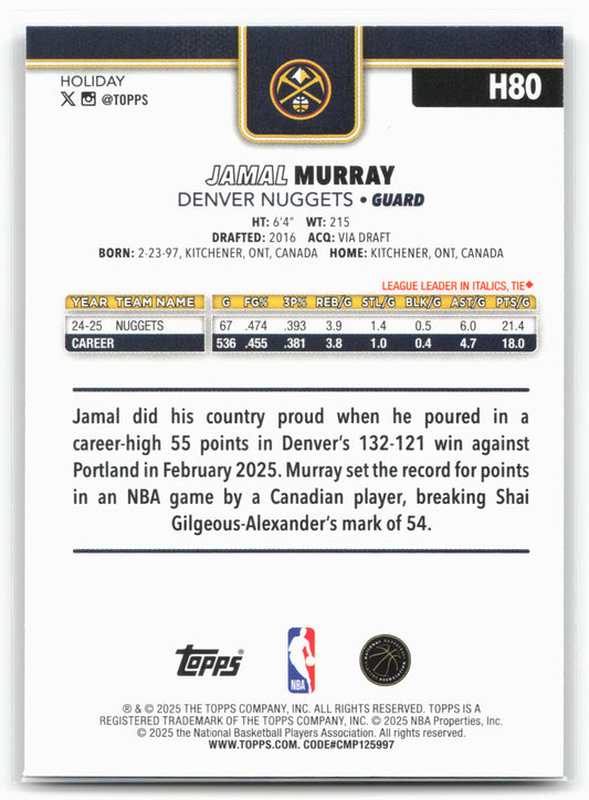 This is a nice example of a 2025-26 Topps Holiday #H80 Jamal Murray Other important information about this card:In 2025 Jamal Murray played for the Denver Nuggets.Please check out our...
