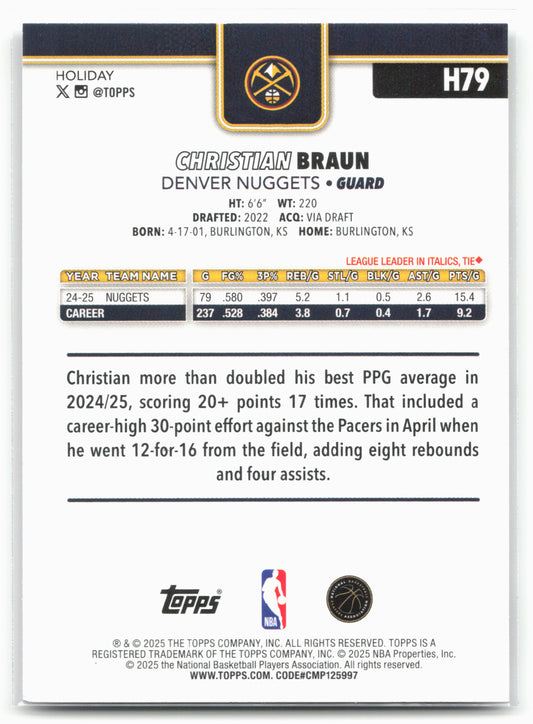 This is a nice example of a 2025-26 Topps Holiday #H79 Christian Braun Other important information about this card:In 2025 Christian Braun played for the Denver Nuggets.Please check out our...