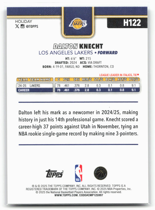 This is a nice example of a 2025-26 Topps Holiday #H122 Dalton Knecht Glitter Holiday Other important information about this card:In 2025 Dalton Knecht played for the Los Angeles Lakers.Please...