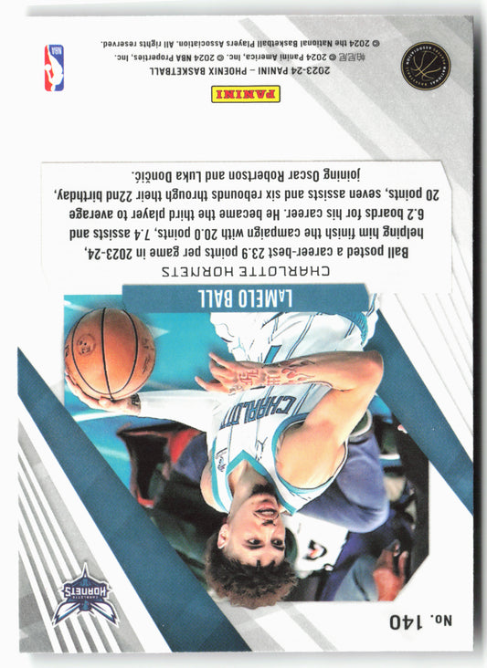 This is a nice example of a 2023-24 Panini Phoenix #140 LaMelo Ball Phoenix Red Ice Other important information about this card:In 2023 LaMelo Ball played for the Charlotte Hornets.Please...