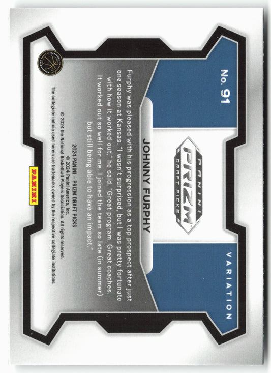 This is a nice example of a 2024 Panini Prizm Draft Picks #91b Johnny Furphy Other important information about this card:In 2024 Johnny Furphy played for the Kansas Jayhawks.Please check...