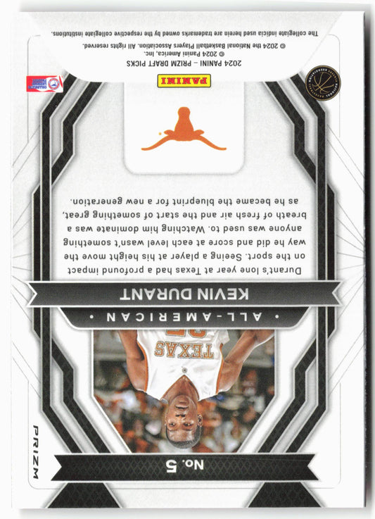 This is a nice example of a 2024 Panini Prizm Draft Picks #5 Kevin Durant All-American Prizms Orange Ice Other important information about this card:In 2024 Kevin Durant played for...