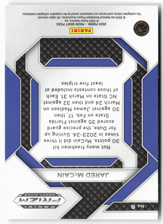 This is a nice example of a 2024 Panini Prizm Draft Picks #8 Jared McCain New Recruits Other important information about this card:In 2024 Jared McCain played for the Duke...