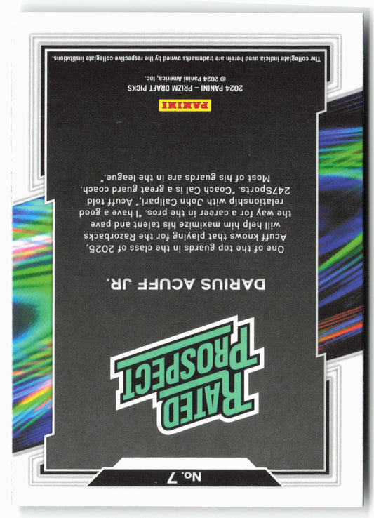 This is a nice example of a 2024 Panini Prizm Draft Picks #7 Darius Acuff Jr. Rated Prospect Other important information about this card:In 2024 Darius Acuff Jr. played for...
