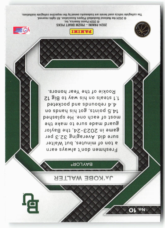 This is a nice example of a 2024 Panini Prizm Draft Picks #10 Ja'Kobe Walter New Recruits Other important information about this card:In 2024 Ja'Kobe Walter played for the Baylor...