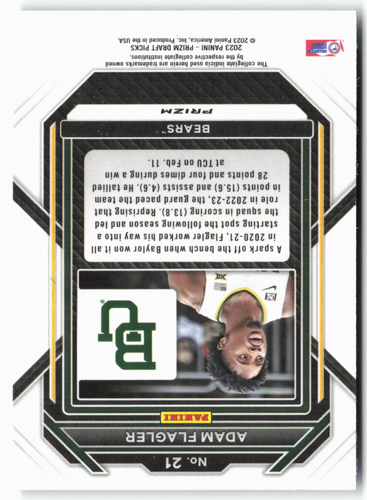This is a nice example of a 2023 Panini Prizm Draft Picks #21 Adam Flagler Choice Blue/Yellow/Green Other important information about this card:In 2023 Adam Flagler played for the Baylor...