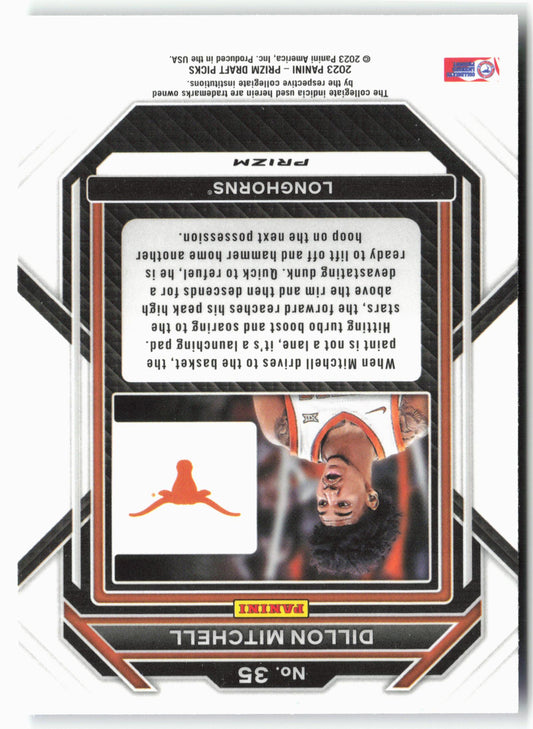 This is a nice example of a 2023 Panini Prizm Draft Picks #35 Dillon Mitchell Choice Blue/Yellow/Green Other important information about this card:In 2023 Dillon Mitchell played for the Texas...
