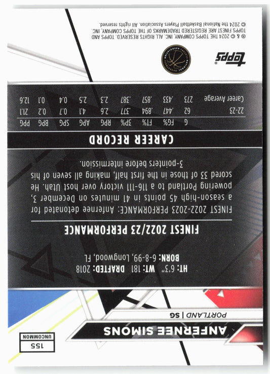 This is a nice example of a 2023-24 Finest #155 Anfernee Simons Other important information about this card:In 2023 Anfernee Simons played for the Portland Trail Blazers.Please check out our...