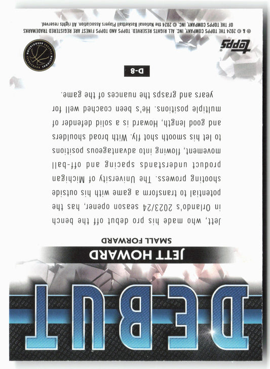 This is a nice example of a 2023-24 Finest #D-8 Jett Howard Debut Other important information about this card:In 2023 Jett Howard played for the Orlando Magic.Please check out our...
