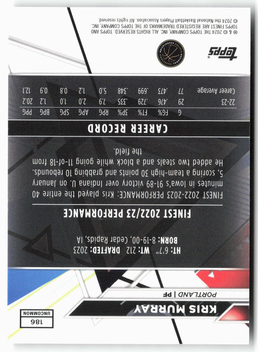 This is a nice example of a 2023-24 Finest #186 Kris Murray Checkerboard Refractors Other important information about this card:RCIn 2023 Kris Murray played for the Portland Trail Blazers.Please check...