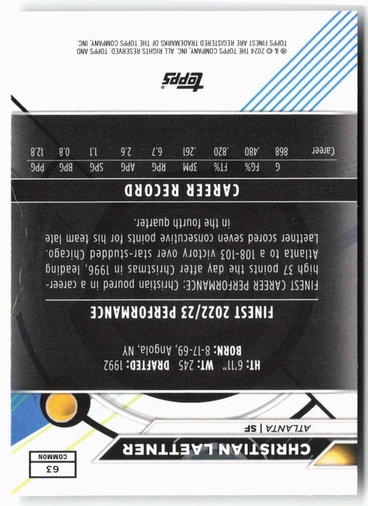 This is a nice example of a 2023-24 Finest #63 Christian Laettner Other important information about this card:In 2023 Christian Laettner played for the Atlanta Hawks.Please check out our other...