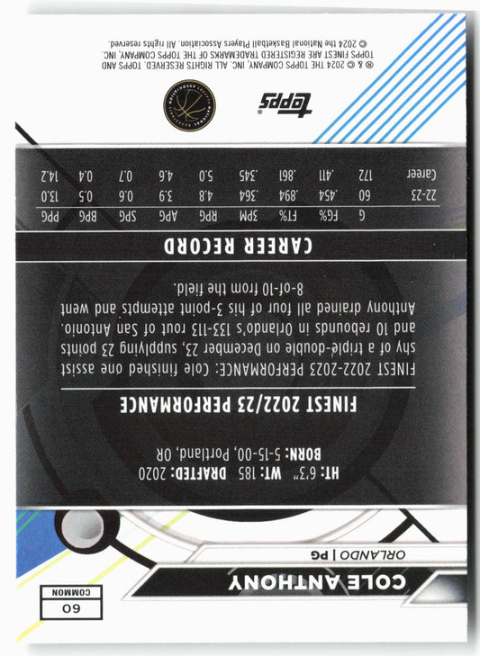 This is a nice example of a 2023-24 Finest #60 Cole Anthony Other important information about this card:In 2023 Cole Anthony played for the Orlando Magic.Please check out our other...