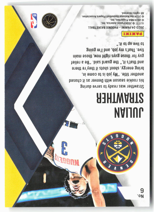 This is a nice example of a 2023-24 Panini Phoenix #6 Julian Strawther Instant Phenom Other important information about this card:In 2023 Julian Strawther played for the Denver Nuggets.Please check...