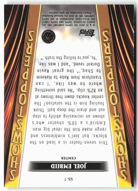 This is a nice example of a 2023-24 Finest #SS-7 Joel Embiid Showstoppers Other important information about this card:In 2023 Joel Embiid played for the Philadelphia 76ers.Please check out our...
