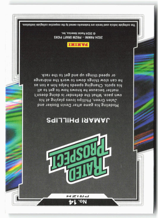 This is a nice example of a 2024 Panini Prizm Draft #14 Jamari Phillips Rated Prospect Other important information about this card:In 2024 Jamari Phillips played for the NCAA.Please check...