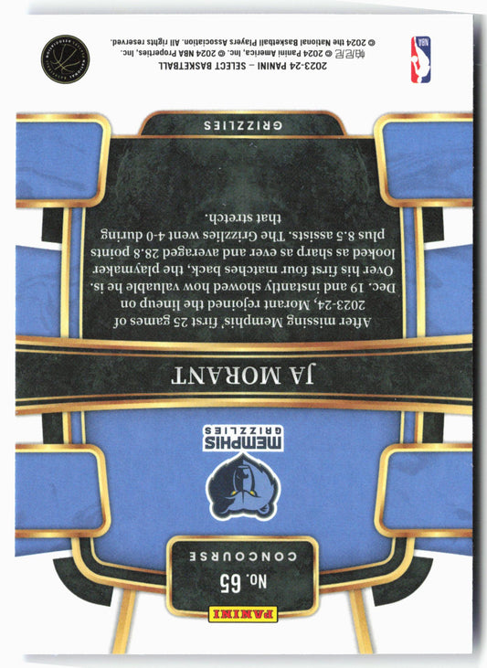 This is a nice example of a 2023-24 Panini Select #65 Ja Morant Blue (Retail Base) Other important information about this card:In 2023 Ja Morant played for the Memphis Grizzlies.Please...