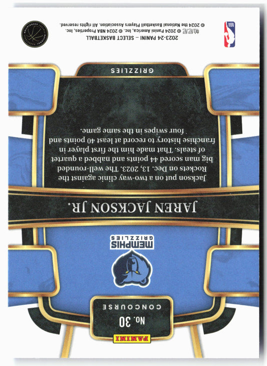 This is a nice example of a 2023-24 Panini Select #30 Jaren Jackson Jr. Blue (Retail Base) Other important information about this card:In 2023 Jaren Jackson Jr. played for the...